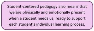 Another important part of experiencing a meaningful learning experience comes from getting support when needed – not for finding the correct answers, but for strengthening our individual learning processes. While we all learn in the similar way by interacting with environment and then internally elaborating to make sense of the new information and fit into our own existing knowledge structures, we also have individual differences like the quality and amount of our previous knowledge. Understanding and supporting these personal processes [2] is the key to fostering lifle-long learning, which is why teachers need to be proficient with both SEL and Trauma-Informed Practices.